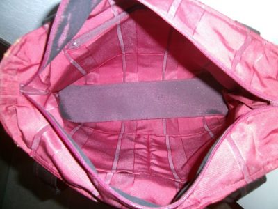 Recycling-Schultertasche beidseitig aus Fahrradschläuchen und roten Stoffen gefertigt. Das Futter besteht aus rotem Stoff. In der geräumigen Tasche sind noch zwei Innentaschen eingenäht (eine Tasche mit Reissverschluss). Die Tasche ist oben mit einem Reissverschluss verschliessbar. Zwei nicht verstellbare Träger.